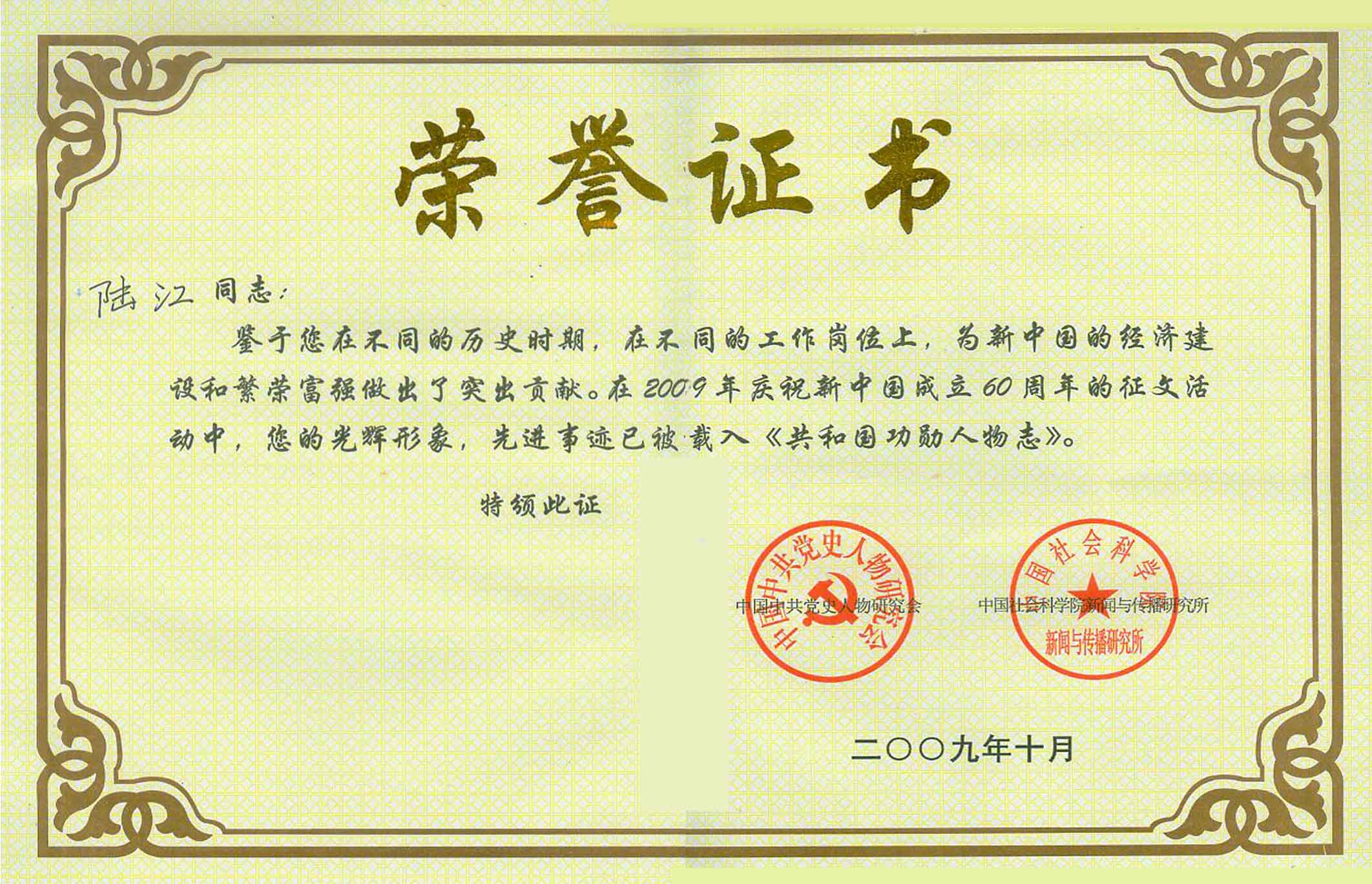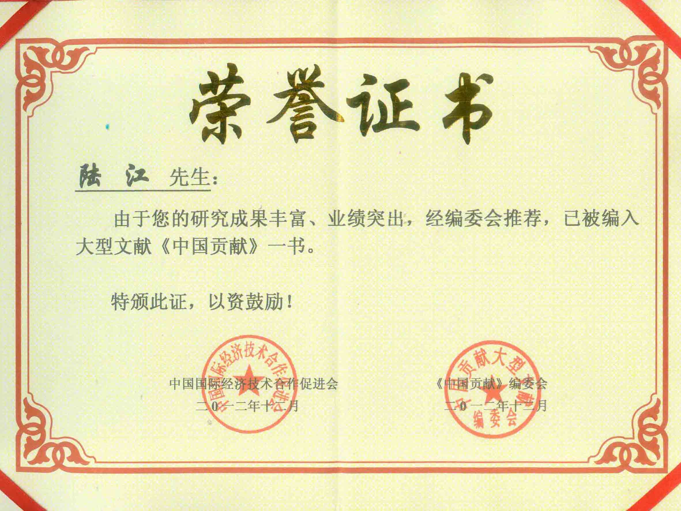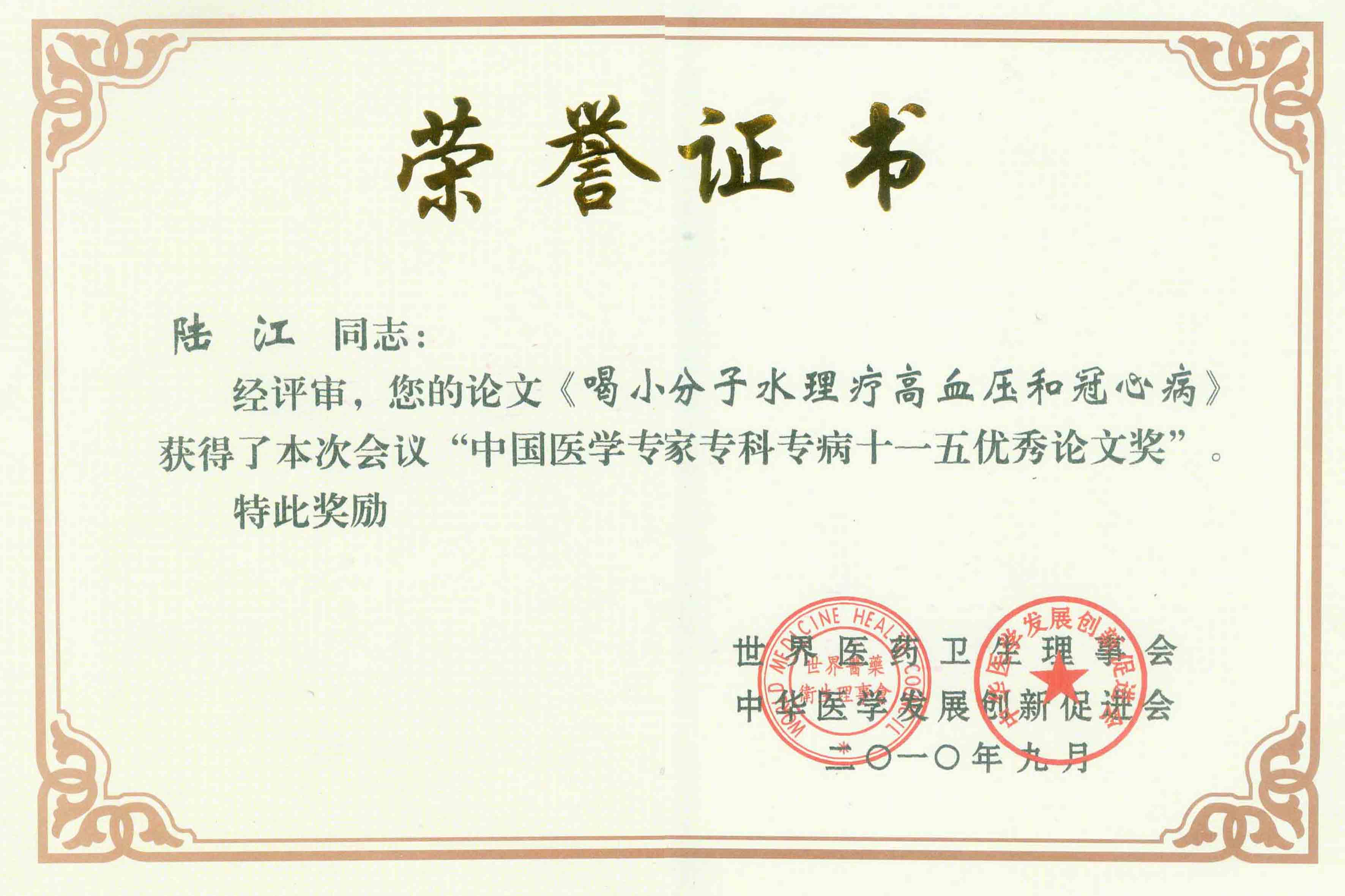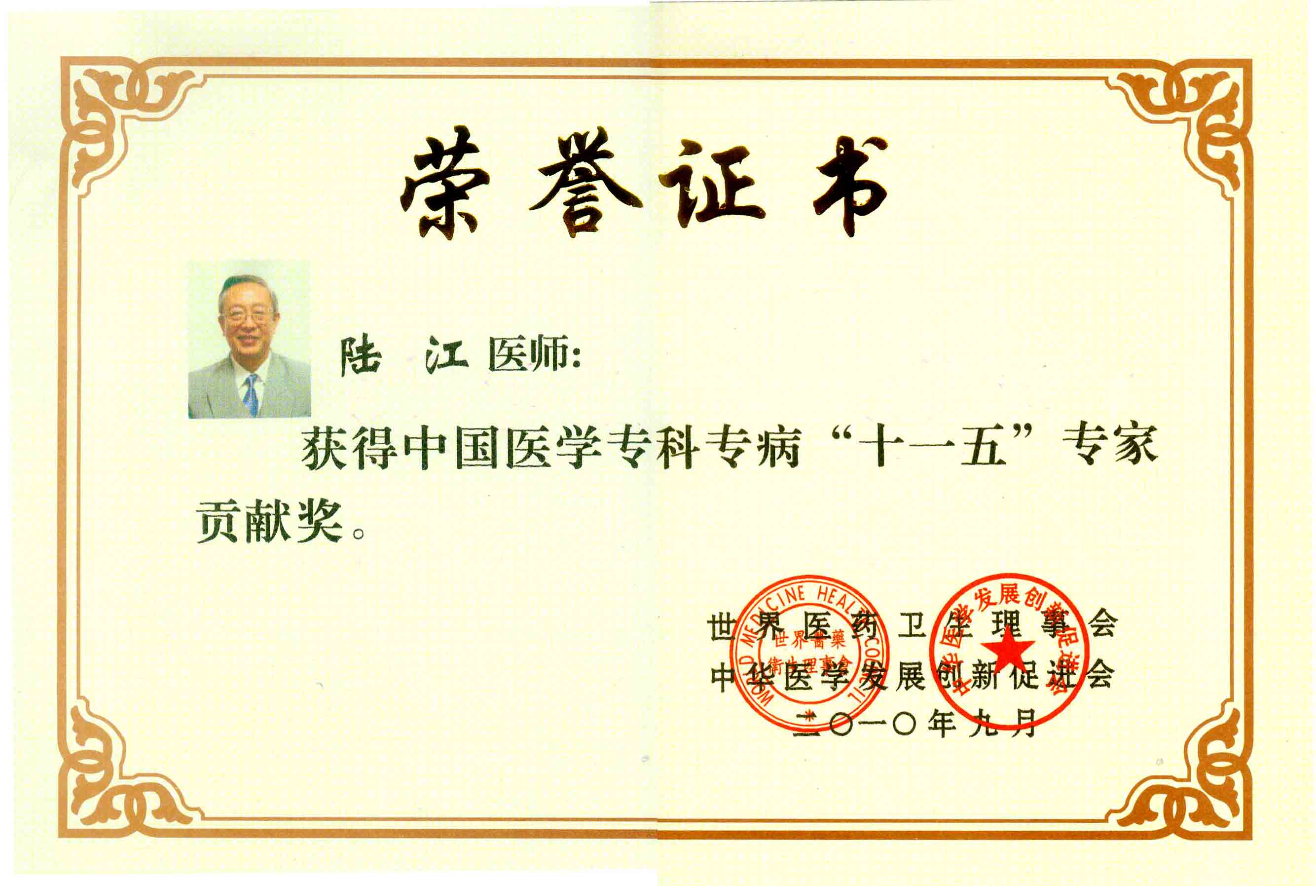 陸江獲得中國醫學??茖2炐銓<沂褎e貢獻獎